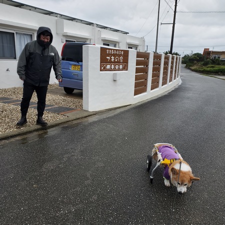 そしてようやく雨止んでくれたし軽くお散歩行きますかってことでごちそうさまして準備したら、タプーちゃん抱っこで玄関出ると おやおや!?って、いやいや!ってまた軽く降ってるし、せめてトイレだけでも!って歩き出したら 今すぐ出して~!って・・・