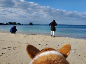 ごちそうさましたらタプーちゃんのお散歩行きますかって張り切って出発したら、後ろからテクテク歩いて来るワンコに あの子が昨日のオヤツの!って話したり、タプーちゃん前見てよ!ってメリーが気になって全然進まぬタプーちゃん笑ったり。そして今日は隣のビーチに行きますかって ここにもあるんだ!って入り口入ったら、穏やかになって来たねって海は・・・