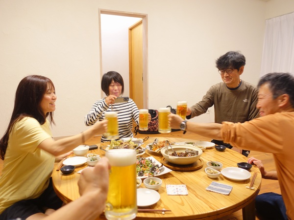 ガチャンとやったらまた個別にガチャンとやってはまた笑顔でガチャンとやって、泡消える~!って笑って僕らはグイッとやるも、また料理の写真撮ってから手を合わせようとするエリさんに 飲んでないよ!ってまさかの乾杯した後飲み忘れってあるんだって大笑い。ではようやく手を合わせたらこれからどうぞな一品は、3種類あるし一緒にねってことなんだけど、みんなバラバラ これじゃないの!?って言いつつ笑いつつ、みんな揃って美味しい笑顔になってます。お次は これがミユちゃん気になってたヤツ!っての味わったり、タカシくんの大好物は これは永遠に食べれるヤツだ!ってノアちゃんにも大好評。