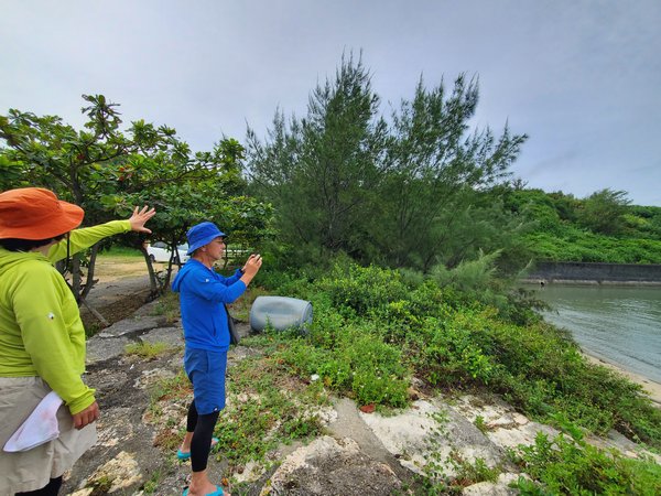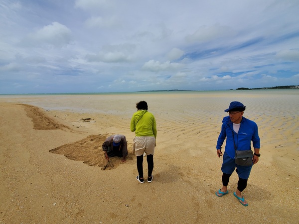お店を出たらポツポツ降ってたけどすぐ止んでくれたしラッキーだねと、次はどこへ!?って質問に 海辺を歩く場所!って返したら、緑の細道に クイナだ!ってそっと眺めてみたりして、そこから緑のトンネルをテクテク歩いては チョウチョがいっぱい!って、生えてる木が全然違うよ!って興味津々キョロキョロと。そしてここだねって場所から海に出たら、キレイ~!って引き潮の海は広がり感じていい感じ、そんな浜辺に怪しげなオジーを発見、近付き声掛けたら 貝を獲ってるんだ!って・・・