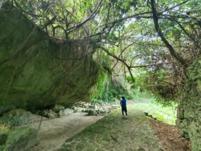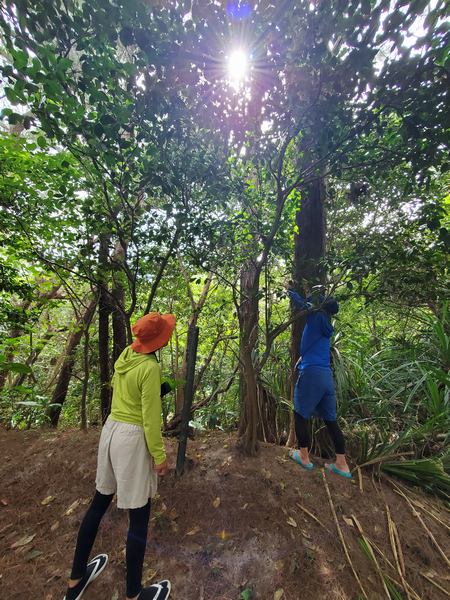 これにてパーントゥを学べたねってことで、お次は高台からの絶景を強風にやられつつも楽しんだり島の牛事情を語ったりしつつ、まさかこっちですか!ってビックリな道に突撃、ビックリな道はビックリなので途中で停めたらここから徒歩で、あれこれ植物眺めたりチョウチョに囲まれたり島の味覚楽しんだり 木陰でそんなに暑くないね!って・・・