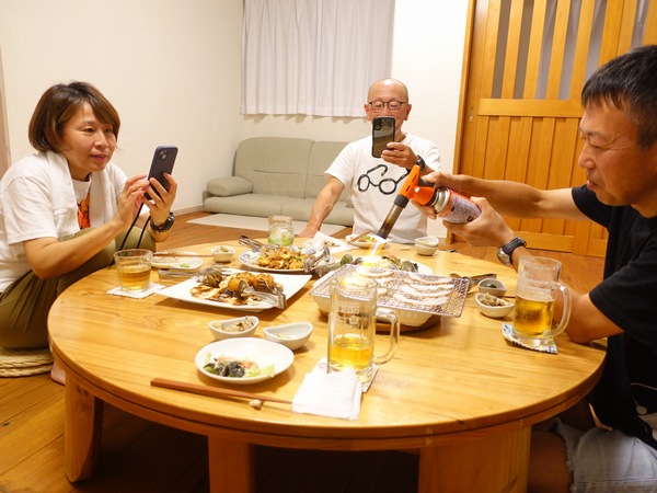 そこからフルパワーで夕飯準備に取り掛かったら、足チャプ楽しんで来たユミさん達も帰って来てシャワー浴びて準備万端整ってます。そして 出来ましたよ~!って登場したら、美味しそう~!って、これは!っていいリアクション。ではでは今日はお疲れさまでした!って、ありがとう!ってことで・・・
