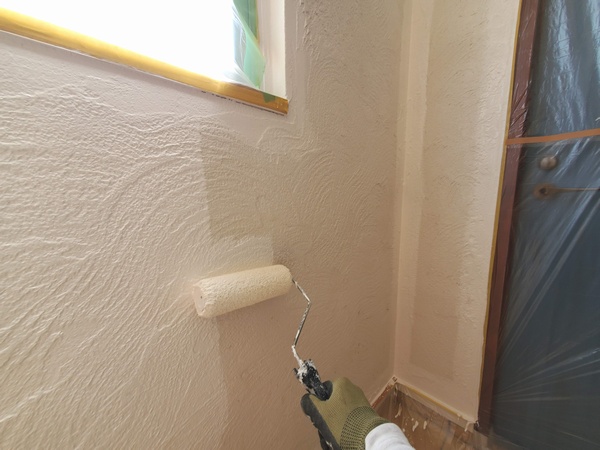 昨日ようやく注文していた塗料が届いたのでね、途中でストップしていた玄関の壁塗りを仕上げちゃいますかということに。一旦外していた養生を改めてやっていったら、まずは周辺部分を刷毛で塗り、そこからは一気に・・・