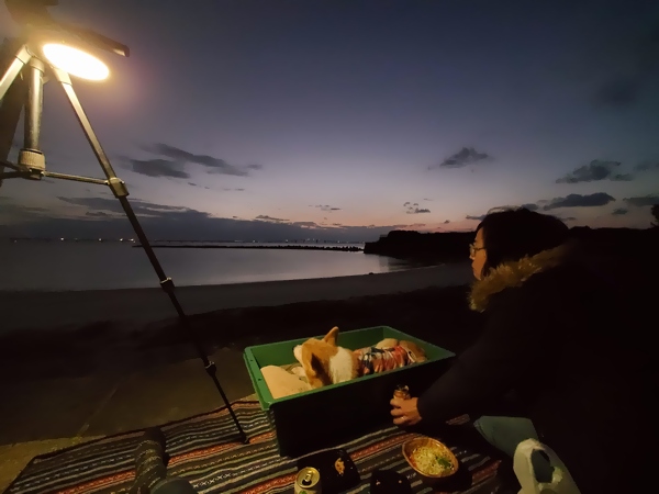 去年秋の北陸旅行が最後と決めたので、もうこの先タプーちゃんを飛行機に乗せてどこかへ行くっていうのはないのでね、島の中で楽しみ見い出そうってことで今日は天気もいいし海辺で楽しむことにしてみましたよ。同じように夕日眺めに来てる人もたくさんいてね、ワンワン可愛い!って嬉しそうに手を振る子供に振り返したりしつつお散歩楽しんだら、今夜はここでプチキャンプ気分を味わいますか。