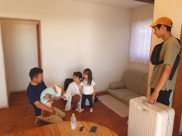 そして夕方レンタカーが到着 よろしくお願いします!って笑顔で登場のゲストさんは、ウチもワンコ飼ってるんです!ってタプーちゃんに会えてニコニコ笑顔でありまして。暑いし中へどうぞどうぞって、ナデナデしてごらん!ってママから順番に・・・