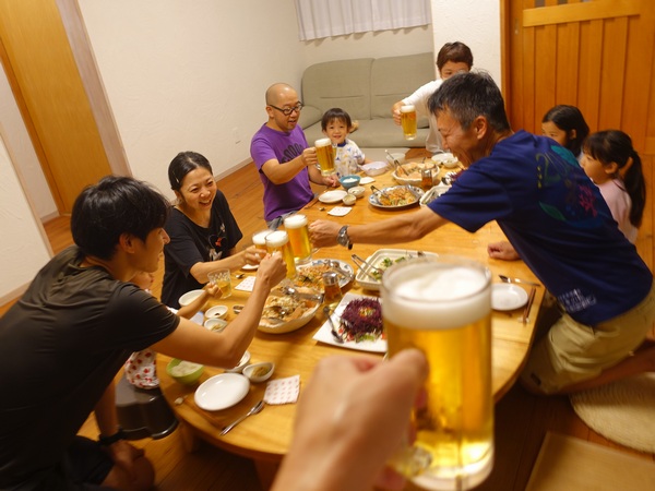 そこから夕飯の仕上げをフルパワーで頑張ったら、出来ましたよ~!って声掛けテンション高いみんなが集まったら、マサくんお酒飲むようになったんだ!ってそれは良いことで。では皆さん飲み物手にしてくださいということで、初めましてと5年ぶりの再会に!ってことで・・・