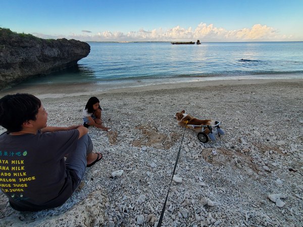 昨夜はしっかり眠れたよ!ってシャキッと目覚めた話だったり、カンちゃん家は海まで歩いて行けるの!?って海辺の街の暮らしを語ってもらったり。ではそろそろ帰ってご飯にしますかと、最後に 今日こそ1回で!ってビュンと投げたら アカ~ン!ってなって、だけど2回目でバッチリ跳ねたら気分よく、そしてサンゴの浜は歩きづらいタプーちゃんなのでミヤちゃんが押してくれたらありがとうって。