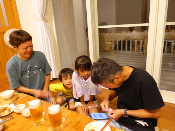 大人もみんなガッツリ食べたらごちそうさまして二次会は、僕手作りの味が登場嬉しそうな顔して食べてるリュウくんに 美味しい!?って聞いたら メチャ美味しい!ってニッコリ笑顔で僕を見つめて来てますよ。そしてリタちゃんが寝ちゃったら、まだまだ元気な子供達だけど 静かにだよ!ってシーってしてはひそひそ声で。