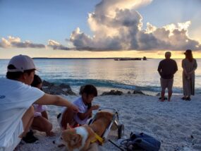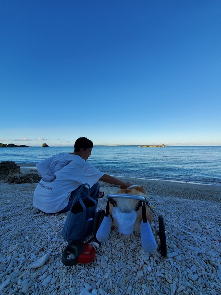 タプーちゃんと並んでサンゴの浜に腰を降ろしたら、景色はいいけど今はいいけど・・・