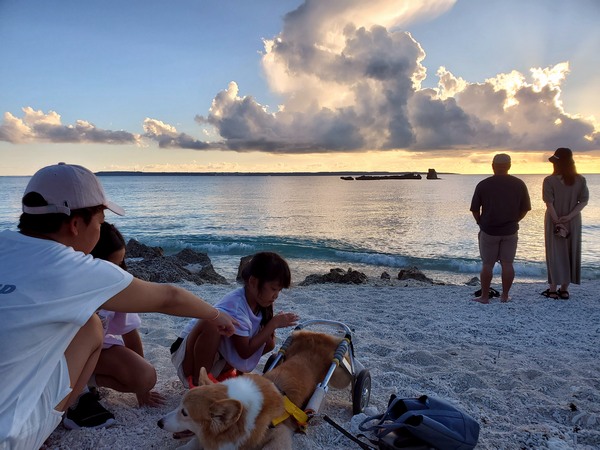 そしてお散歩の時間のちょっと前、今日はバッチリだねってタイミングでカンちゃん達がご帰還 今日の海も綺麗だったよ!って嬉しそうに報告してくれたり、娘二人は車で爆睡だよ!って遊び疲れていたりして。ではお散歩行きますよ~!ってメグミさんの声にお昼寝チームが出て来たら、おはようございます!って声掛けカンちゃん達とご対面して仲良く出発するのを見送ります。そんな夕方のプキビーチは そこじゃな~い!ってちょうどの場所に雲があってね、なんとかこの後・・・
