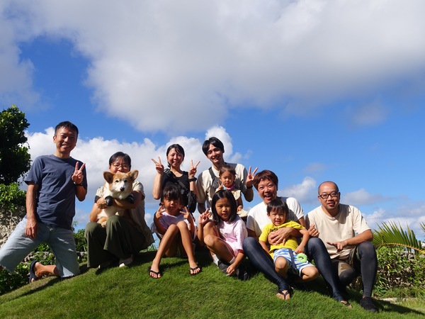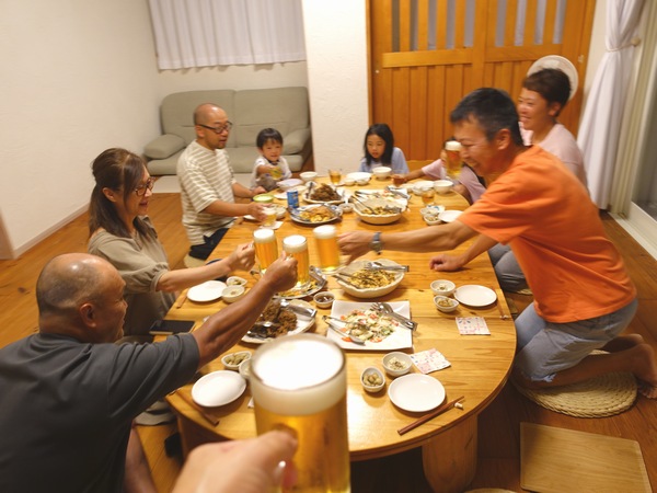 プルプルした手を伸ばして乾杯してるリュウくんに怖い怖いって笑ったら、グイッと飲んでは 美味しい~!ってね。そしてまずはこれからどうぞの一品は、お二人揃って初めてってことなので最初がプキの家スペシャルになるんだねと、ガブッと頬張り 美味しい!!っていい笑顔。お次はチャンプルーの話で楽しんだり 島豆腐いいですね!ってお気に召していただけたり、アオちゃん見てごらん!って手本示したら子供達みんな真似して殻剥き大会みたいになってたり。