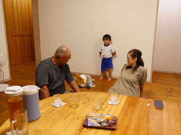そんな海を眺めつつ今のこと先のこと心落ち着け色々語るひととき楽しんだら、さあさあ帰ってご飯にしましょうか。帰って来たらお目覚めのっていうか目覚めの紅芋餅食べてるリタちゃんファミリーと窓越しに笑顔で挨拶交わしたら、さあさあリュウくん達にも起きてもらってご飯にしますよと。