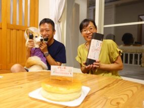 そして寝かしつけのバナナさんが戻って来たら、やっと落ち着いて食べれるわ!ってモリモリ食べてごちそうさま。ではここから大人の時間っていう名のお祝いタイムとなりまして、これも20周年のお祝いで!って素敵な日本酒までいただいちゃったら頑張って持って来てくれたケーキも登場、ほら並んで並んで!って、もう2カ月以上過ぎちゃってますが・・・