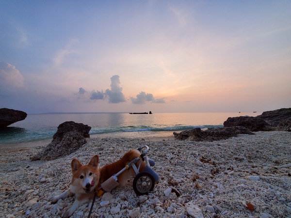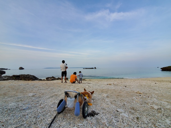 というわけでお仕事頑張ったりボケボケしたり日中過ごしたら、夕方のお散歩は仲良く二人と一匹いつものビーチ。