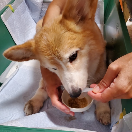 ならば上から押し出す作戦だって、しっかり食べてねってまだ胃が荒れてるし食欲もそんなにないのでふやかしたフードを食べてねと、しっかり食べて・・・