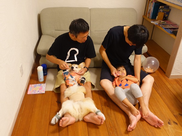 ごちそうさましたら二次会は、ユイちゃん鳩サブレだよ!って大好物登場しては美味しいねって食べたり、そんな姿をキラキラお目々のタプーちゃんに見られていたり。そして今夜も最後はこれだねと、一緒に磨きたいんだもんねってことで・・・