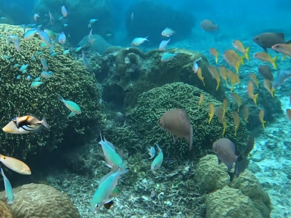 ではお楽しみのシュノーケルといきますかって穏やかポイントに向かったら、ポツポツ雨降って来てるけど気にしない気にしない。でも準備万端海へと突撃しては 冷たい~!って気にしないのは無理なくらいの冷たさで。まあこれだけ雨が続いたら水温下がるよねって、そして3人揃って海パン一丁スタイルなのでそりゃ寒い。なのでそんなお見苦しい姿はお見せで来ませんので、皆さんには水中のお魚さん達を・・・