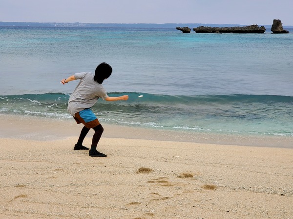 そんなわけで風に吹かれてテクテク歩いてプキビーチ、思ったより穏やかだ!って見納めの景色楽しんではウミガメ探すマサシくんだったり、これなら出来るかもと水切りしては スゴイスゴイ!ってミナトちゃんがやるもドボンでね、アヤちゃんは・・・