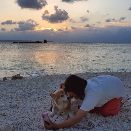 そこから夕飯準備を始めたら、ユキコさんがご帰還 疲れました~!っていっぱい遊んできたようだけど タプーちゃんがお散歩行きたがってるよ!って言うと それはもちろん!ってことで、夕日見れそうだねって楽しみに出発です。そんなお散歩は おやおや!?ってこっちから見ててもそうだったので、ビーチでも残念ながら雲に隠れておりまして、だからお願いタプーちゃん、お顔じゃなくて・・・