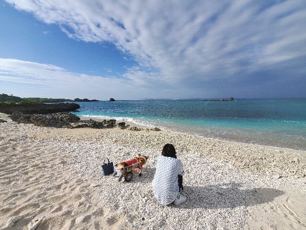 では最後のお散歩行きますかってごちそうさましたら準備して、玄関出たら 暑いよ~!って夏が戻って来たような日射しと風のなさ。そんなお散歩楽しみビーチにやって来たら、陰から出たくないね!って言いつつも見納めの海だし前へと近付いて、見渡す景色は・・・