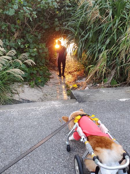 そして夕方ノブユキさんがご帰還、いっぱい歩いてのんびりして来ましたよ!って満足顔で良いことで、ひと休みしたら夕日に合わせてタプーちゃんのお散歩出発 今日は綺麗に見れそうね!って期待感しかない空ですよ。なのでビーチの入り口緑のトンネルは、さらにより一層に・・・