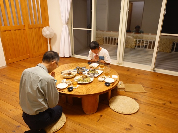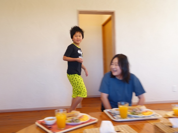 昨夜も星綺麗だったねって翌朝はさらにバッチリ快晴の朝となり、おはようの声掛け合いつつ朝食準備したら 出来ましたよ~!の声に今朝もひとり足りません。なので ナオトワンピース読んでないで呼んで来て!って洗面台のノブユキさんを呼びに行くナオトくんだけど ご飯ですよ!って 声ちっちゃ!って笑っては、ダッシュで戻ってくる子を笑ってます。