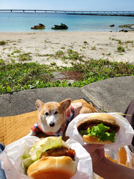 そこからひとまずお仕事片付けたら、買い物ついでにタプーちゃん連れてお出掛けだ。まずはランチだねってことで、また晴れて来たし泳がないけど泳げるくらいのポカポカ陽気だし、久々のモスでテイクアウトしたら海辺に座ってタプーちゃんもシートにお座りしてもらったら、視線感じつつ・・・