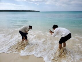 そんな姿を笑ったら、頭上を通過する飛行機見上げたり、沖合を疾走するウインドサーフィン眺めたり、そして これ凄いですね!って砂団子作ってコウヘイくんに手渡すと、かめはめ波のポーズしてはもちろん知らないトモカちゃんのノンリアクションにやられたり。そんなまん丸砂団子でしたが あ!って、やっちまったな!って、今夜はコーレーグースでビールだな!って罰ゲームのようなこと言ってはアタフタして力いっぱい握ってるし 大抵のことは力ずくじゃないんだよ!って笑ってます。