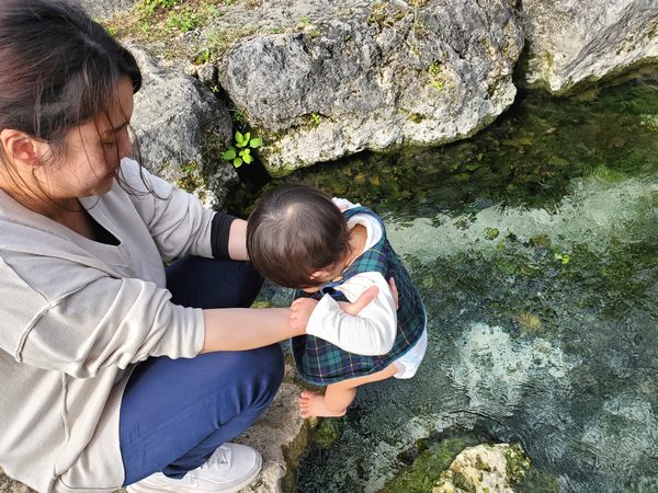 そんな姿を笑いながら楽しんだら、車に戻って ほらまた!って潮まみれのフロントガラスに戻ってますよ綺麗にしましょ。お次はまた綺麗な海だったり漁港の姿を楽しんでは、ホントだお魚見える!って水族館好きさん達に自然のお魚楽しんでもらったり、お魚見れる不思議に迫ったり。そこからは カニ注意の看板!?って話で楽しんで、次にやって来た海はまた青く荒い海なんだけど、まさかよ!?ってシュノーケルの準備して海に向かうオバサンの姿にビックリからの、海に出てさらにビックリ いやいや無理でしょ!ってね。