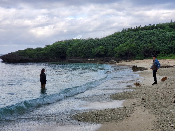 風強いよ~!って上着羽織って出発したら、これ本当に大丈夫なの!?って分厚い雨雲がすぐそこにあるけど風向き的に大丈夫だそうで、と言いつつも軽くポツポツ感じつつ、おしゃべりしながらのんびり歩いてプキビーチ。そんな最後の海は波高めでありまして、そんな海眺めたりジャブジャブ入るノアちゃんだったり、ウルさんも・・・