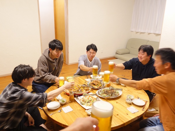 そこからみんな夜に向けて準備したら、料理が完成 ゴーヤーだ~!って嬉しそうなメンバーだったりテンション高くいい感じ。ではではそれぞれ飲み物手にしたら、今年もお世話になりました!いやなってないか!?って笑いつつ・・・