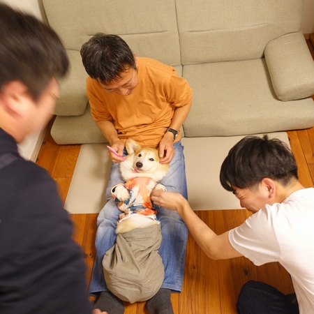 いやあ笑った笑った!って楽しんだらそこからはワンコ苦手トークとなりまして、僕も昔はそうだったから!って分かるよ分かるって話から、最後は歯磨き姿を だから可愛いのは分かるんだって!って近寄れない子の手をグイッとススムさん、強引に触らせたら叫んで心拍数上がりまくりのユウトくん。だけど最後は勇気を振り絞り・・・