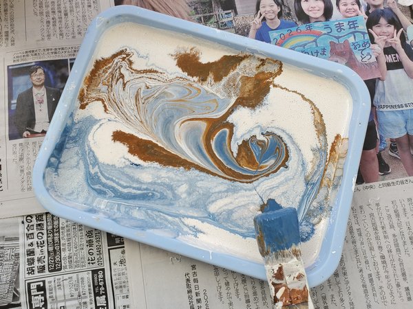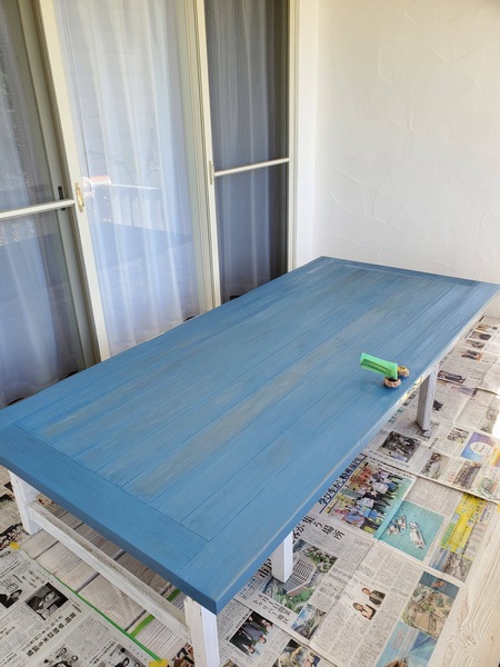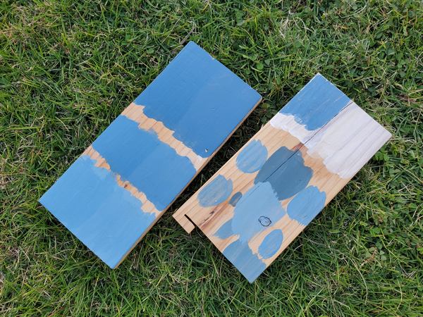 今回新たに購入したのは青のみでね、もちろんこの青だけだと思ってる色にならないので、手持ちの白と茶色を混ぜて色を出してく作業を本番でやるってなかなか無謀な挑戦です。まあ最初は下塗りだし思ってる色から多少外れても問題なしと大胆に混ぜたら最初の慎重にはどこ行ったって感じではありますが、サンプル板の右の真ん中ちょっと暗めの落ち着いたトーンに近いイメージで、調色した塗料を早速塗っていきますよ。