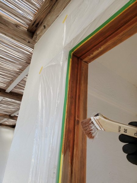 そんなドアの乾燥タイムはドア枠の塗装タイムでありまして、こちらは茶色で仕上げるので、浸透系の塗料でしっとりと・・・