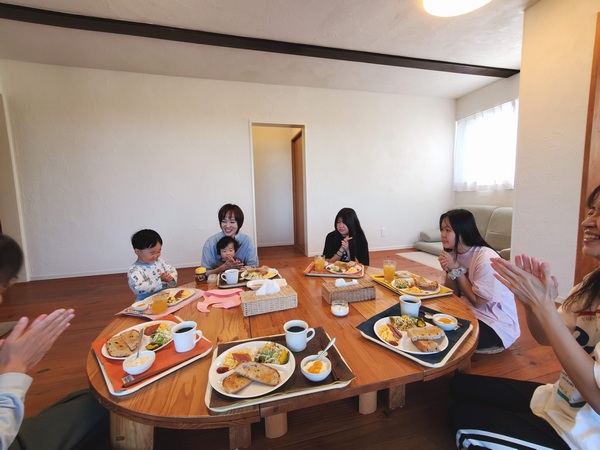 というわけで今朝もみんなで声揃えていただきますしたら、今日は本当に最高だよ!って、もう帰らなきゃなんて・・・って1泊は短すぎるよってマキちゃんだったり、バナタくんは朝からモリモリ食べてるけれど、やっぱりエプロンいるって!ってダラダラこぼして大変だ。どこの海がいいかって、今日は泳げるんじゃない!?とか言ってるけれど、お昼過ぎの飛行機だしあんまり時間ないよねと、お散歩も行けるかどうかって準備頑張らなきゃってことで、ひとまずごちそうさましたら 行きたい行きたい!ってバタバタと帰り支度を頑張ります。