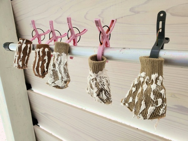 そんなお散歩は いい感じいい感じ!って昨日仕込んでおいたヤツが大活躍でありまして、それはデッキ屋根の仕上げに使ったコーキングを使ってね、タプーちゃんのお散歩靴下の滑り止め加工をしたのでね・・・
