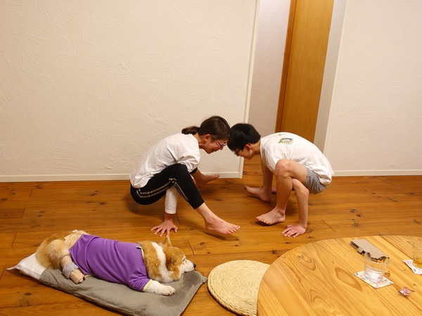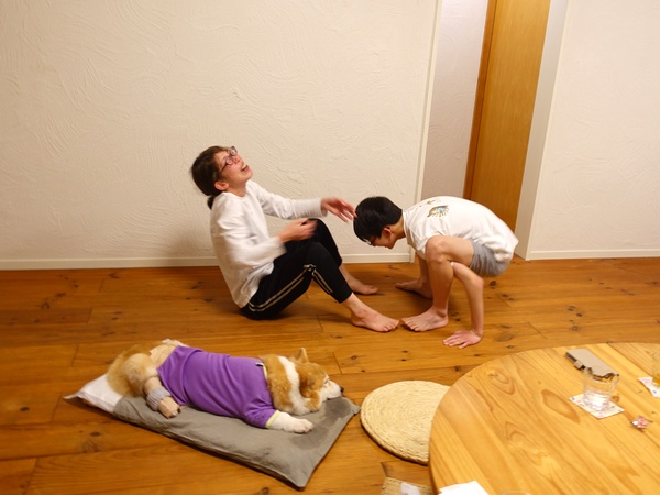 カエル得意やねん!ってのを、足を前パターン後ろパターンでみんなでやっては出来たり出来なかったり、ねえねえ向かい合ってやろうや!って息子と母で対決するも、こんなん無理や~!って・・・