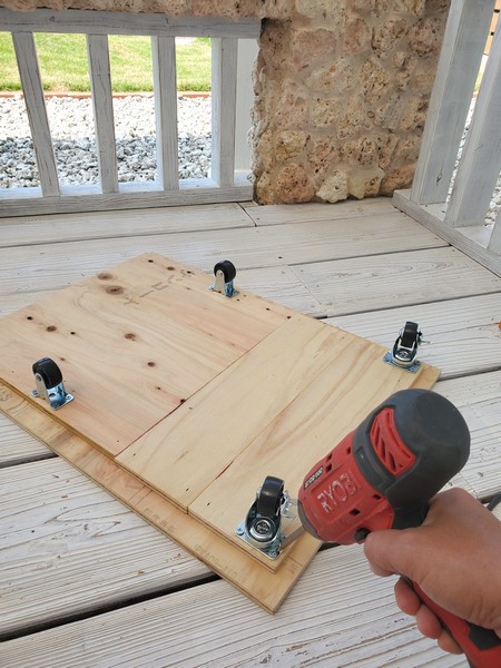 そこからは今日も作業を進めますよということで、材料買い揃えて来たし早速組み立て取り付けていきますよ。まずはこちら余り材で作ってるやつですが、何を作ってるかというと冷凍庫の可動式台でありまして、諸事情によりタイヤの位置が・・・