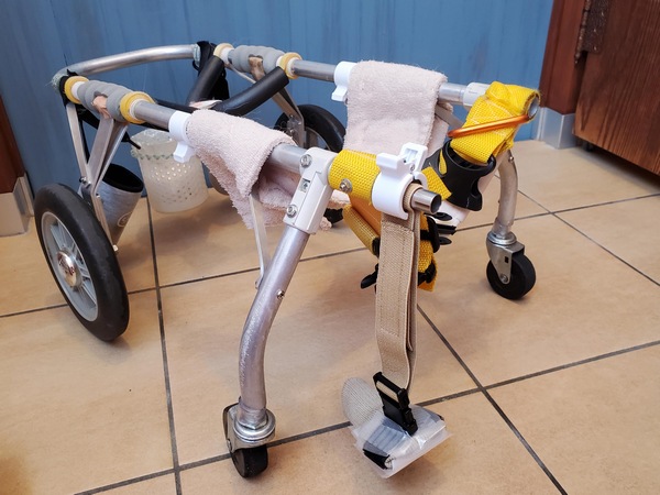 そんなわけで車の補修が出来たらお次はこちらの車をね、今朝もまだイマイチだったし車椅子のプチ改造。車椅子からゴムで靴を吊る形になってるんだけど、もうちょい前で吊りたいなってのを、無理矢理形にしてみたら・・・