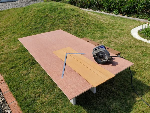 というわけで今日は合板一枚使って棚作りっていうか、棚板作りって言った方が正しいか。まずはお庭に出して来たら作業台代わりのベンチ2つに乗せて、あらかじめ引いておいた図面通りにライン引いたら・・・
