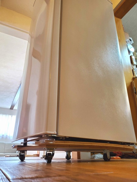 つまりは先日の冷凍庫台、一応出来上がりはしたんだけど不具合発覚もうちょい改良加えなきゃと、一旦下ろして表にひとつ裏に2つパーツ取り付けたら いい感じいい感じ!ってバッチリ仕上がり満足です。