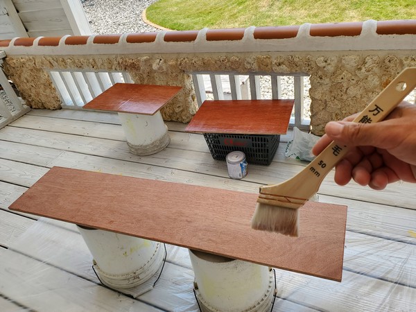 そしたら次なる作業は塗装でね、ニスのようでニスじゃないってあんまり使いどころのなかった塗料をここで使っちゃいますかって、塗ったら いい感じいい感じ!って程良いツヤ感としっとり飴色になっていきますよ。