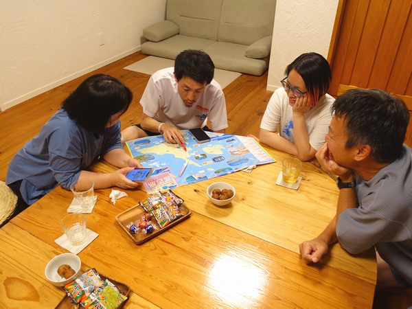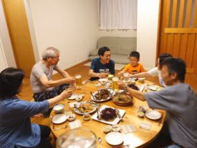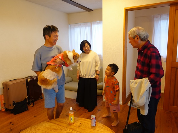 そして夕方 ただいまー!って、ジイジとバアバ迎えに行って来たよ!って声がして、タプーちゃん抱えてデッキに出てはお出迎え。というわけでやって来た本日のゲストさんは、リオちゃんのご両親テツオさんとサユリさん。ひとまずお外でおしゃべり楽しむも 蚊がいっぱい!って入って入ってと、中に入って落ち着いてから・・・