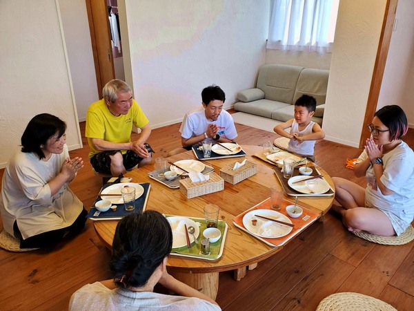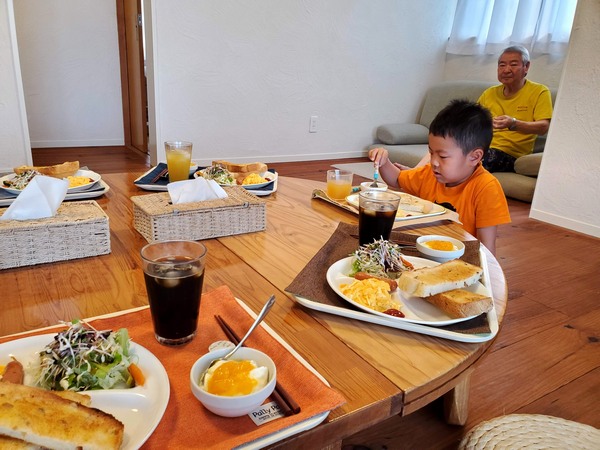 なので我慢してもらったらみんな着席 それじゃあ張り切ってどうぞ!ってアキヒロくんに振るも、昨日普通に言えたじゃん!ってモジモジしちゃってダメダメで。なのでみんなで手を合わせたら パン手作りですか!ってサユリさん、私も家でねって、カスピ海ヨーグルトも何十年と!ってな話で盛り上がったり、新聞広げてコースや交通規制のチェックしたりワイワイと。そして今朝も食の進まぬ子は無理矢理口に押し込まれてたり、震災の時は!?って当時の大変さを語ったり、僕らが泊まった温泉地も豪雨災害で!ってな話になったりと。