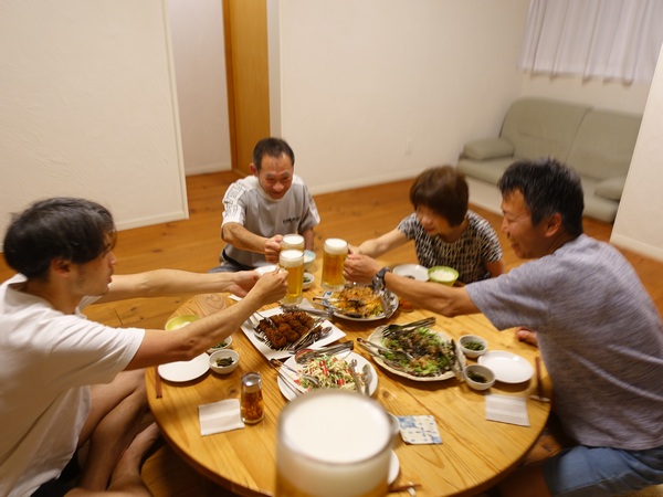 そこからは夕飯準備しつつ仕事終わりのカズナリくんの帰りを待ち、夕日が沈んでから帰って来たら 今日はまた凄い夕日でした!ってみんな大喜びでいい写真撮れたみたい。そんなこんなでみんな揃ったところに料理が登場 美味しそう~!って大喜びで、久々の再会とお疲れさまと!ってことで・・・