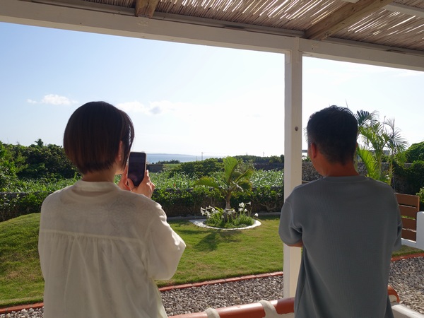 それからしばらくして次なるゲストさん到着 ヒロユキさ~ん!って笑顔で駆け寄りタプーちゃんナデナデしては嬉しそう。そんな二組目のゲストさんはプキの家大好きマイッペで、色々変わったんだって案内したりタプーちゃんの話になったり明日来るユミッぺの話になったり、そうだ写真送ってあげなきゃ!ってタプーちゃんと僕らのスリーショット撮っては送ってあげたりと。それにしてもアレだねと、明日雨とは思えないね!ってデッキに出たら、ユミッぺにも晴れの写真を!ってことで・・・