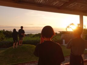 では 夕日は今日しか見れないかもよ!?って楽しみにしつつそれぞれ夜に向けて準備して、そして 夕陽見るなら今だよ~!ってメグミさんの声に、ドライヤーの音が止まりデッキにお庭に出て来たら、雲に隠れる直前の・・・