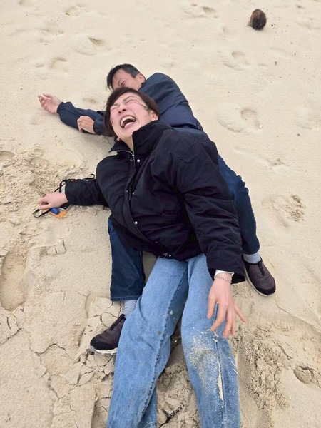 そんな最初の海楽しんだら、あそこに青空が!ってほんのちょっとだけ青見えるしそいつを目指して出発で、車停めたら これホンマに行くの!?って何度も振り向き先頭のマミちゃんが突撃僕らもちゃんと後を追ったら ヒロさん競争だ!って負けたらおんぶの罰ゲームって砂浜ダッシュをマミちゃんと。もちろん僕の圧勝で、振り向いたら ほら来て!ってマミちゃんなのでガフッと背中に乗ったら ヒロさん軽!ってテクテク歩き、最後は砂に足を取られて・・・