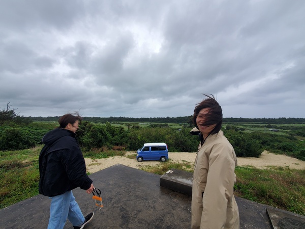では一旦ラストとなるツアーはラストとなるバモスに乗り込みスタートで、どうしてやろうかって言いながら走り出しては ホンマやカクカク!ってカクカクステアリング楽しんでもらいつつ海目指します。荒れても大雨でも尚青い海眺めるのはいいけど これ車から降りれます!?ってどう見てもよって天気なんだけど、行くぞ!ってカッパ着て傘差して外に出たら、もう無理傘閉じて~!って壊れるくらいの強風で、だけど安心してね・・・