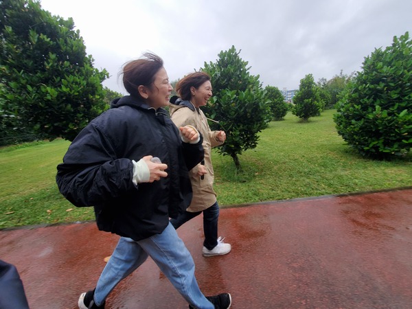 なんでまたこうなるん!って言いつつ1周だけねって、半周で心折れそうになるもなんとか頑張ってノルマの1周走り切ったら しんどいわ!って、靴もびしょ濡れやし!って言いつつ 6200歩超えた!って雨のツアーとしては十分動いたでしょってみんな揃って達成感。そこから帰り道もワイワイ楽しんだりプキの家での出会いを語ったりしつつ帰って来たら、3人で写真撮ってなかったし!ってことで、それじゃあバモスと一緒に!って記念の一枚撮って玄関開けますか。